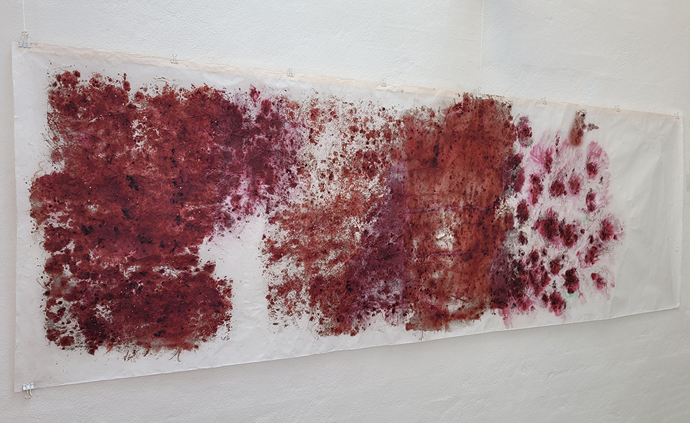 <> Pressede cochenillelus på kinapapir, samlet ind på Tenerife 2019. 70 x 200 cm. Foto: Lisbeth Nielsen Lyrstrand.Foto: Lisbeth Nielsen Lyrstrand© Copyright Lisbeth Nielsen Lyrstrand