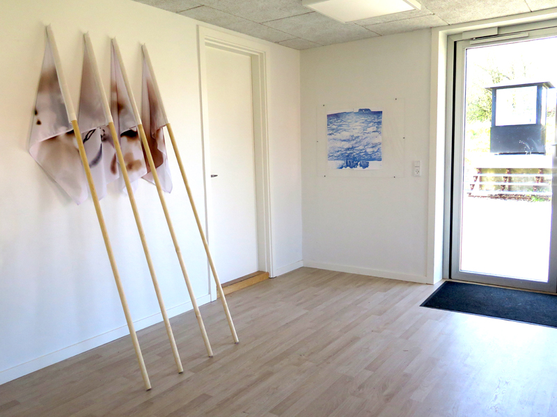 <> Fra Holme Kunsthal, kantinerum. Print af Gul Engmyre-eng 50 x 50 cm 2019 Polyesterflag med print af myrekryb. 60 x 84 cm 2019Foto: Lisbeth Nielsen Lyrstrand© Copyright Lisbeth Nielsen Lyrstrand