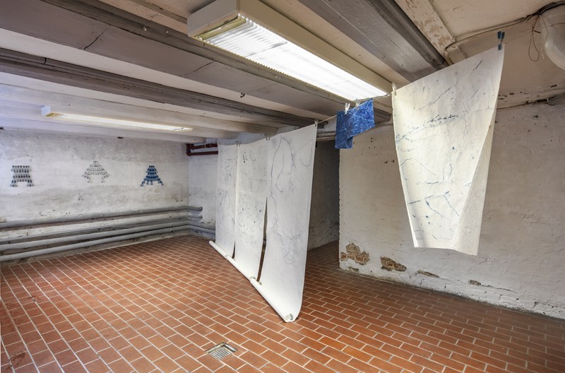 <> ”24 plastikklemmer”, ”28 plastikklemmer”, ”29 plastikklemmer”, ”Jordspor” frottageteknik af skovbund med karbonpapir 70 cm b., tøjsnor og plastikklemmer.Foto: Ole Akhøj© Copyright Lisbeth Nielsen Lyrstrand
