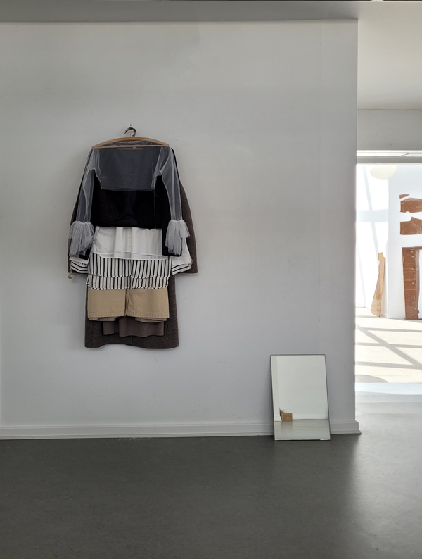 < > ”Garderobe” Tøj på bøjle og spejl på gulv, 2024.Foto: Lisbeth Nielsen Lyrstrand© Copyright Lisbeth Nielsen Lyrstrand