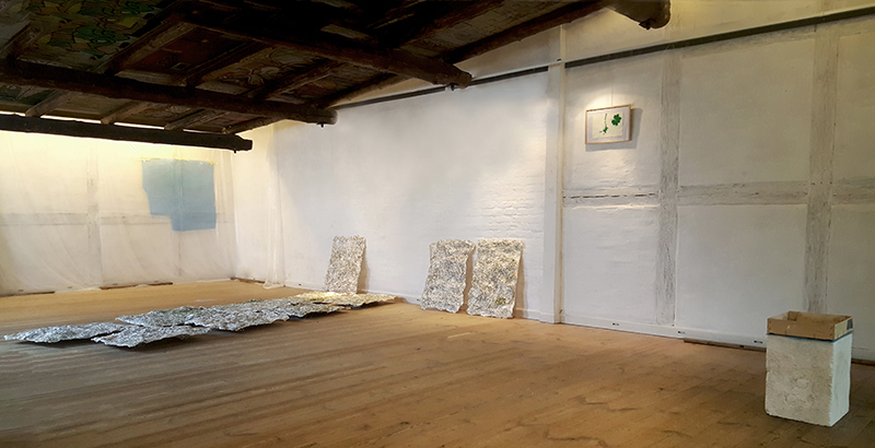 <> Gipsaftryk af græstørven. Blå plastfolie. Akryl på papir i glas og ramme 32 x 42 cm.Foto: Lisbeth Nielsen Lyrstrand.© Copyright Lisbeth Nielsen Lyrstrand