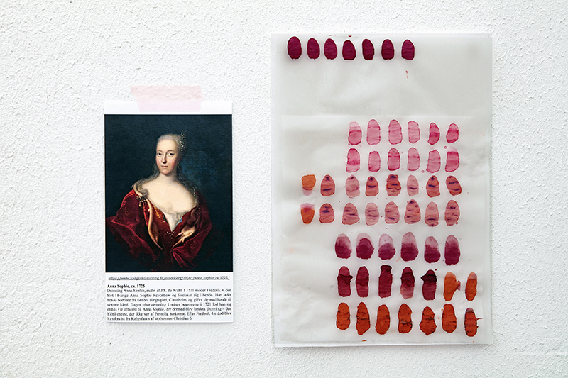 <> Farveprøve (kalke-papir) 29x21 cm 2021 og Dronning Anne Sophie, print og tekst.Foto: Ole Akhøj© Copyright Lisbeth Nielsen Lyrstrand