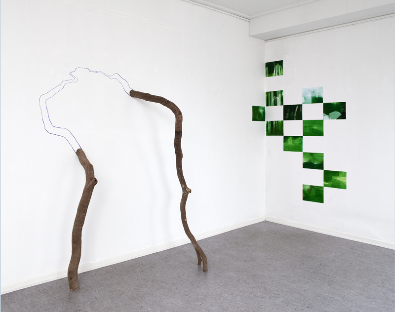 <> Grene og tape på væg 190 x 115 x 80 cm. - ”Udsnit fra det grønne dyb” 2014, 11 x A4 digital tegning/print.Foto: Lea Nielsen© Copyright Lisbeth Nielsen Lyrstrand