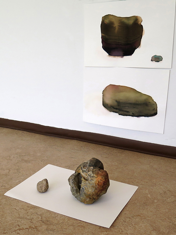 <> ”Natur I en tynd tråd”. Akvarel på papir A3 og sten på gulvetFoto: Lisbeth Nielsen Lyrstrand.© Copyright Lisbeth Nielsen Lyrstrand