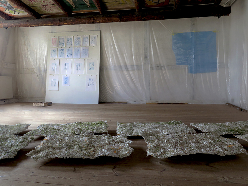 <> Gruppeaftryk med karbonpapir, A4 og A3 på MDF-plade + opsamlingskasse. Blåt plastfolie.Foto: Lisbeth Nielsen Lyrstrand.© Copyright Lisbeth Nielsen Lyrstrand