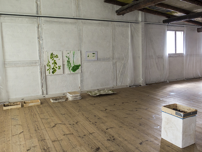 <> Aftryk af vegetation på papir 70 x 50 cm og A4. Støberammer og gipsaftryk af græstørv + bobleplast 30 x 40 cm. Gipsaftryk af græstørv 56 x 83 cmFoto: Lisbeth Nielsen Lyrstrand.© Copyright Lisbeth Nielsen Lyrstrand