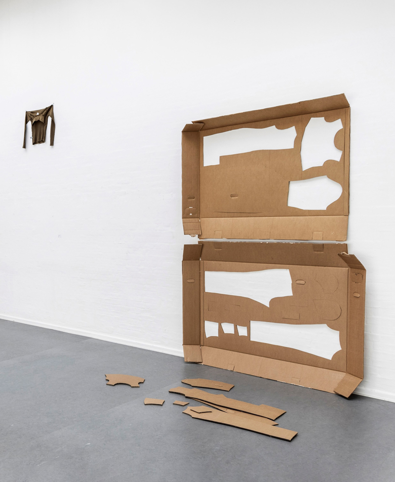 < > T-shirt med vrangen ud 2024. 2 x modelskabeloner skåret i genbrugspapkasse 2024, 160x107x21 cm.Foto: Ole Akhøj© Copyright Lisbeth Nielsen Lyrstrand