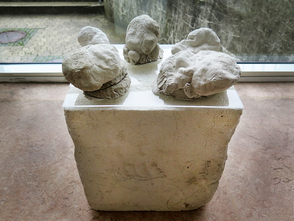 ”Natur I en tynd tråd”. Gipsafstøbning af fyrsvampe, plexiglas og flamingo 56 x 40 x 30 cm