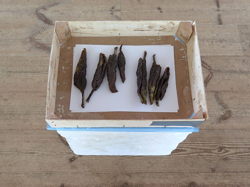 <> ”Balsamerede” skud af skræppeblade, med PowerTex og opsamlingskasse. Blåt plastfolie og flamingosokkel. 50 x 30 x 40 cmFoto: Lisbeth Nielsen Lyrstrand.© Copyright Lisbeth Nielsen Lyrstrand