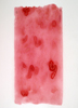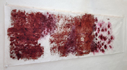 ”Når æggene er lagt klækkes de, nymferne bruger deres munddele til at suge sig fast, de bliver siddende. Cochenillelusen snylter på kaktussen, efter 3-4 måneder er hunlusene fulde af befrugtede æg og høstes til farvning.” Uddrag fra midgaardshaven.dk På en rejse til Tenerife 2019, fandt jeg de 2-4 mm store Cochenille-hunlus på figenkaktusplanterne. Lusen, hvorfra man udvinder farven Karminrød, er gennemgående i alle disse værkerne. Lusen og farven kom til Europa med Columbus. Dengang anvendte man farven til eksklusive tekstiler til konger og gejstlige. I dag anvendes farven med mærket E-120 til kosmetik især læbestift og til madfarve for eksempel røde sodavand. I udstillingerne ”HUN-cochenillelus” spejler farven og dens historie følelser erindringer fra et kvindeliv. |